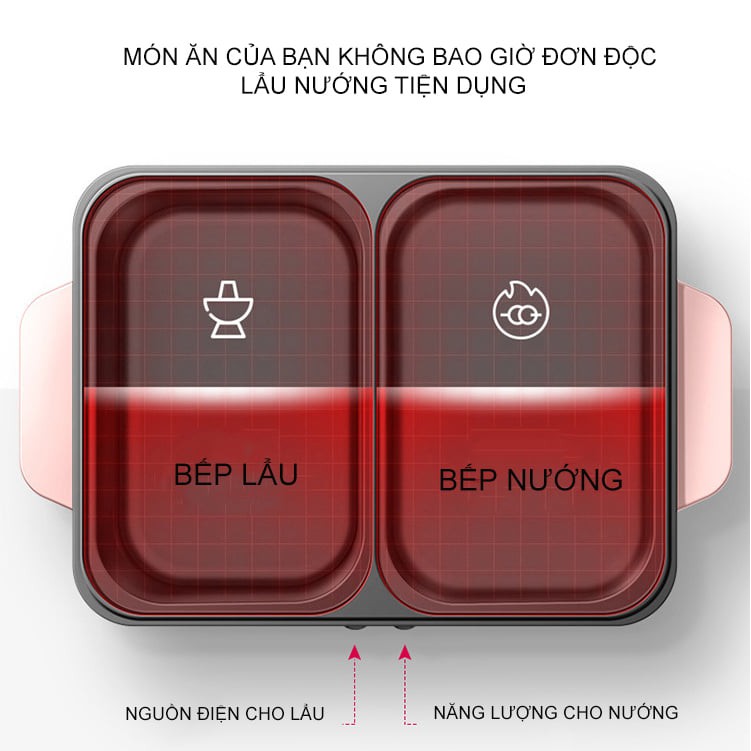 Bếp có 2 ngăn tiện dụng, 1 ngăn nấu lẩu/ canh, 1 ngăn nướng/ chiên/ rán, 1 bữa ăn sẽ vô cùng tiện lợi và nhanh chóng với chiếc bếp đa năng này.