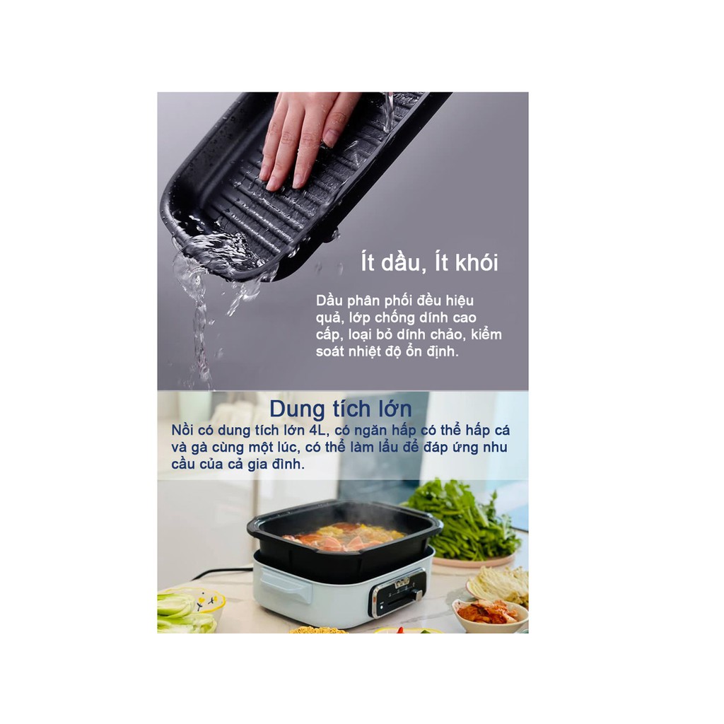 + Đi kèm với nồi lẩu là 3 khay lẩu, nướng và khuôn làm bánh giúp khách hàng chế biến đa dạng các món ăn tại