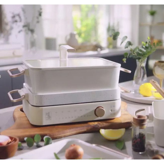 - Thiết kế gọn gàng và sang trọng với tone màu be phù hợp với mọi không gian bếp, một bộ gồm 1 bếp, 1 nồi nướng, 1 nồi lẩu và 1 nắp kính.