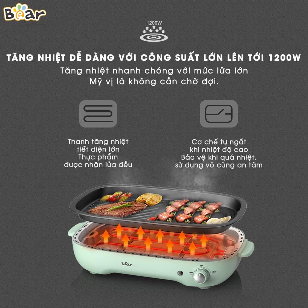 ✔️ Nồi lẩu nướng đa năng 3 khay Bear có thiết kế 4 thanh nhiệt trải đều, tiếp xúc trực tiếp với các khay, tạo mức nhiệt lớn, giúp thực phẩm được chín nhanh và chín đều các mặt. Với công suất cao 1200W kết hợp với các nút điều chỉnh nhiệt độ trong phạm vi từ 0-230 độ, bạn hoàn toàn có thể yên tâm chế biến các món ăn, tự điều chỉnh mức nhiệt phù hợp với đặc điểm của mỗi món và an tâm thưởng thức món ngon sau khi chế biến.
