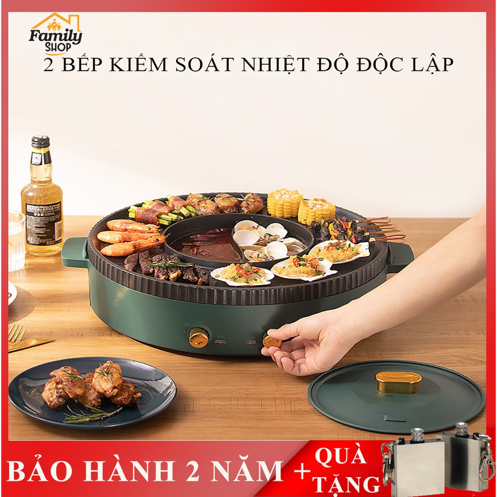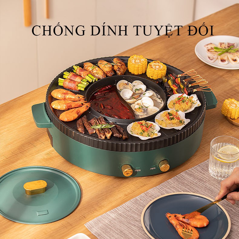 Nồi lẩu nướng điện đa năng 2 ngăn vừa lẩu vừa nướng không khói tiện dụng 2 nút điều chỉnh nhiệt độ