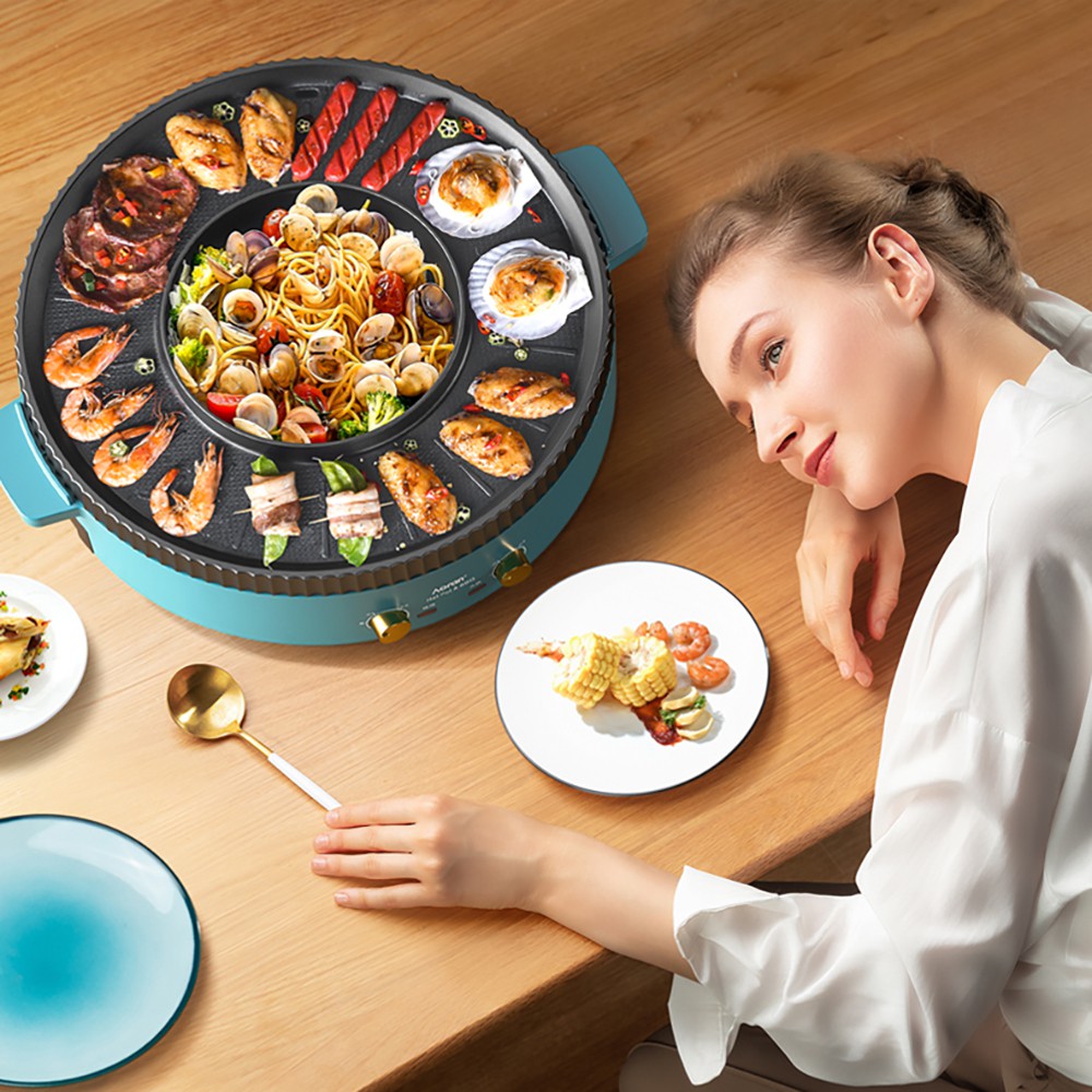 - Với bếp lẩu nướng tròn 2in1, người sử dụng có thể vừa nướng nhiều loại thức ăn và đồng thời nấu lẩu cùng một lúc.