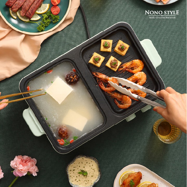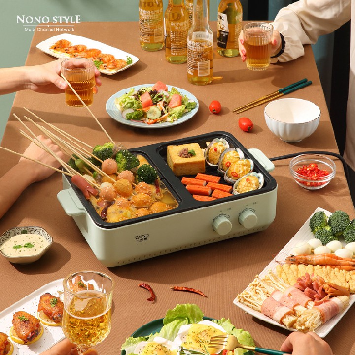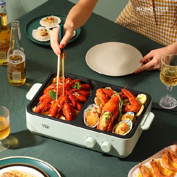 Nồi nầu lẩu, nướng, chiên, xào dành cho khoảng 3-4 người. Tiết kiệm không gian. Lịch sự, xinh xắn với lớp chống dính, 2 nút kiểm xoát nhiệt riêng biệt của 2 khay.