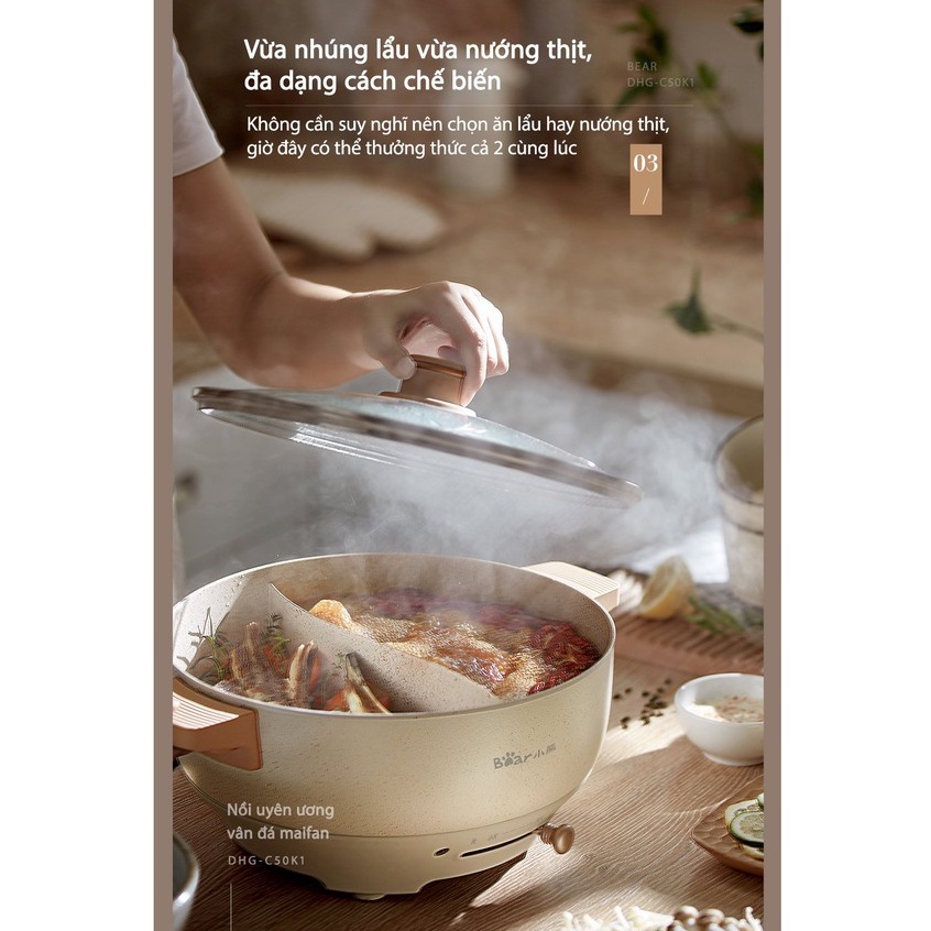 Nồi lẩu nướng điện mini đa năng 2 ngăn uyên ương Bear DHG-C50K1 5L, bếp nướng lẩu 2 ngăn điện mini công suất 1500w