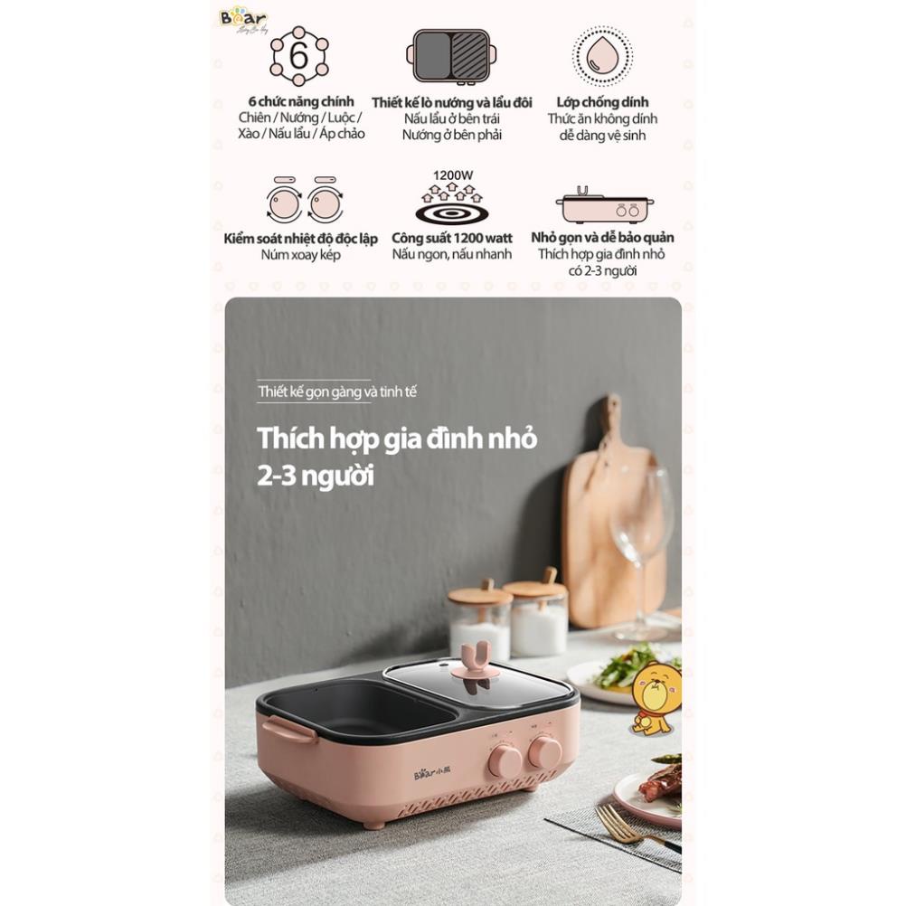 Nồi lẩu nướng mini Bear bếp lẩu kiêm nướng đa năng 2 trong 1 nhanh gọn tiện lợi Gia dụng Bear Tuli MartThưởng thức 2 phong cách ăn cùng lúc với nồi nướng lẩu mini Bear DKL-C12D1 tích hợp 6 chức năng: Chiên, nướng, luộc, xào, nấu lẩu, áp chảo ngay tại gia. Nồi nướng lẩu mini Bear DKL-C12D1 sở hữu thiết kế thông minh với 2 khay Nướng - Lẩu vừa phải thích hợp cho 2-3 người ăn kết hợp cùng công suất 1200W và phù chống dính tiện lợi cho việc vệ sinh sau khi sử dụng