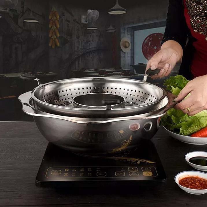 🍀Với thiết kế cực kỳ thông mình và tiện lợi. Nồi chia làm 2 tầng và 2 khoang, đáp ứng được sở thích của cả gia đình. Với 2 khoang riêng biệt có thể chọn 2 loại nước dùng cùng 1 lúc, có thể chọn cay và không cay. Còn thiết kế 2 tầng với nồi cố định và 1 khay khi xoay lên thì có thể lọc được toàn bộ đồ ăn đã nhúng. Giờ thì các mẹ khi ăn khỏi phải lo ngồi vớt mà vẫn bị sót đồ ăn rồi ạ.