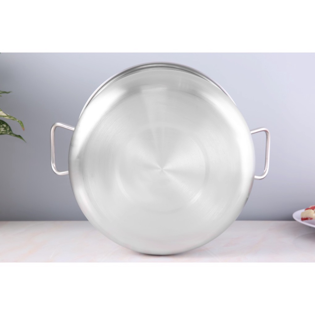 Nồi 1 đáy thiết kế rộng, phẳng. Đặc tính của inox là ít phản ứng với thức ăn, an toàn sức khỏe, nấu thức ăn chín nhanh, tiết kiệm năng lượng tối ưu