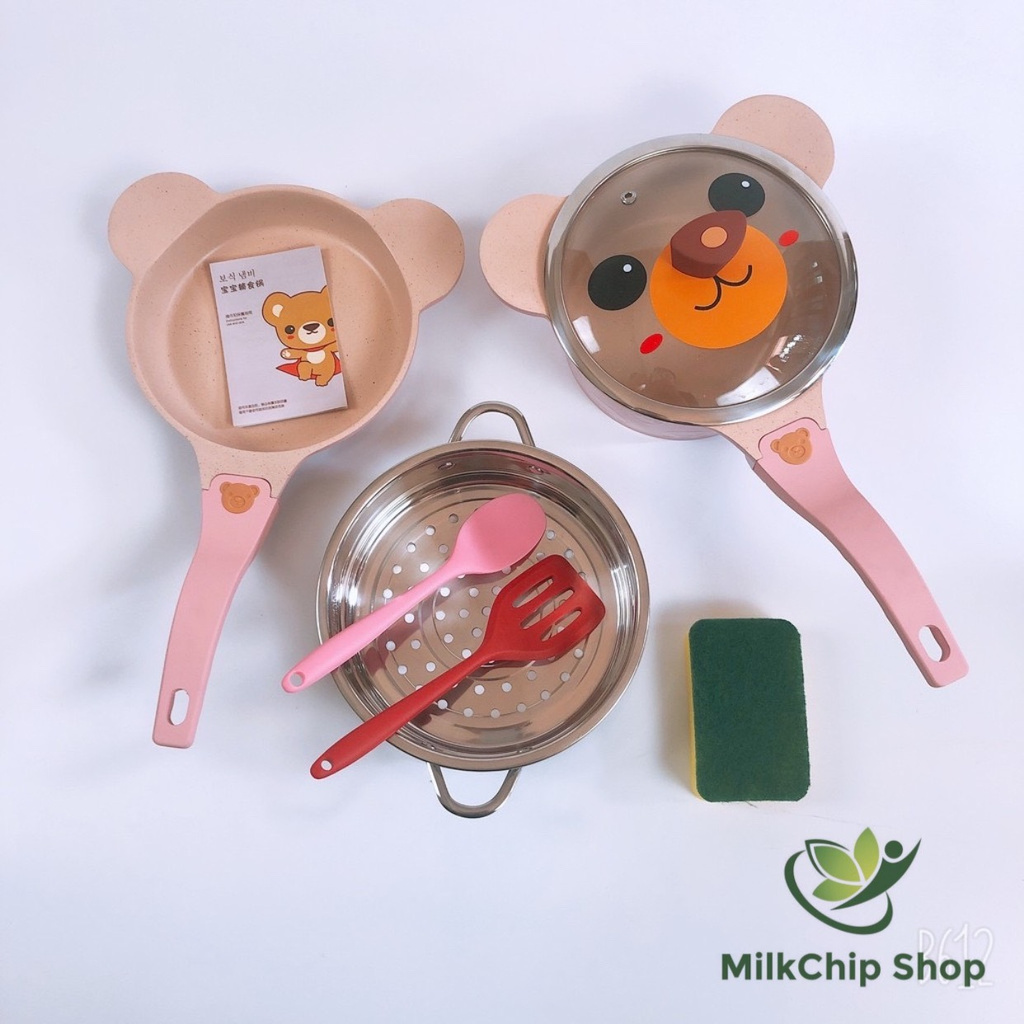 Bộ nồi nấu ăn dặm cho bé men đá chống dính kèm chảo inox size 18 xuất Hàn hình gấu A048