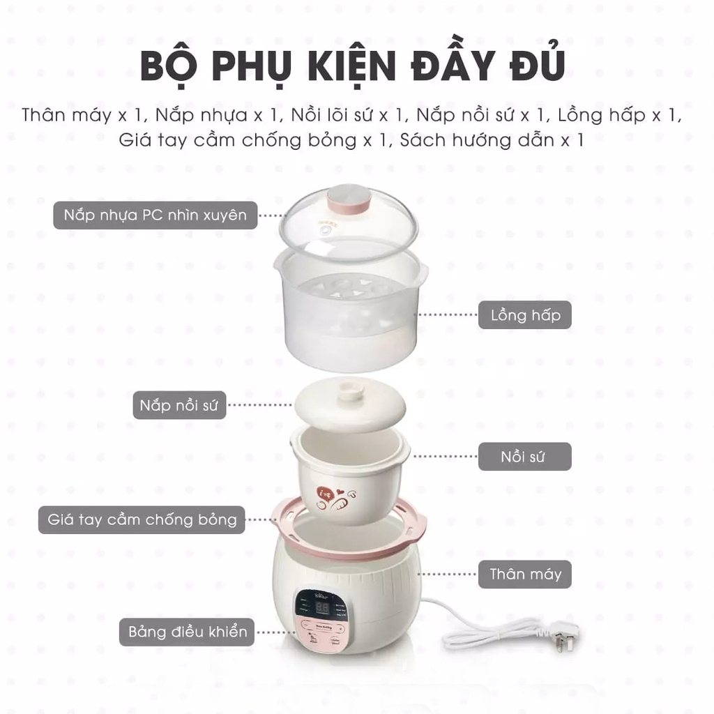 Thông số kĩ thuât Nồi nấu cách thuỷ Bear SUBE001 nấu cháo chậm, cho bé ăn dặm, dung tích 0.8L tặng kèm lồng hấp 1L: