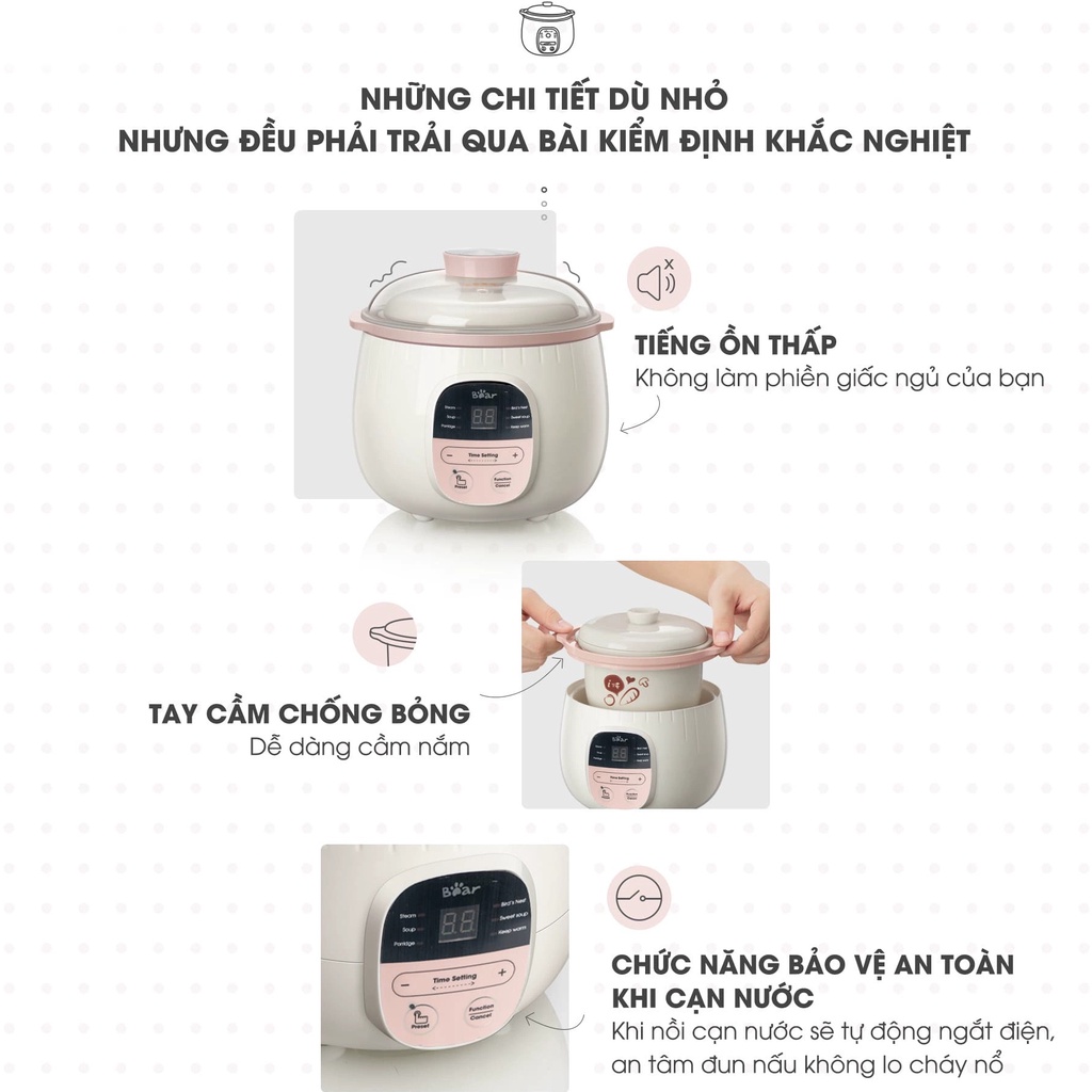 Nồi nấu chậm Bear xứng đáng là "chiếc nồi quốc dân" với chức năng hẹn giờ nấu thông minh lên tới 9.5 giờ. Thêm vào đó, với khả năng giữ nhiệt món ăn tốt, nồi nấu cháo chậm Bear là giải pháp hoàn hảo dành cho những người bận rộn, đặc biệt là các bà mẹ bỉm sữa; các bạn sinh viên phải học tập, làm việc tại cơ quan cả ngày, ít có thời gian chuẩn bị bữa ăn; thậm chí là những người cao tuổi.