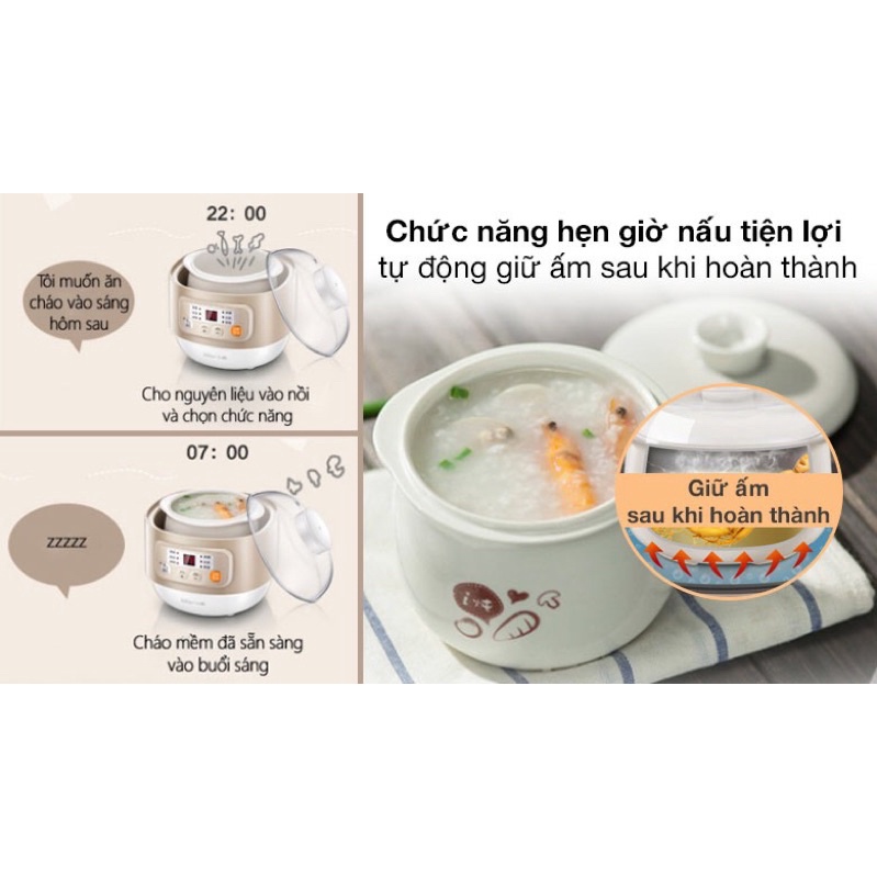 Nồi nấu chậm Bear có 6 chức năng: Hấp, hầm canh, nấu cháo, chưng yến, súp, ninh với các mức thời gian được lập trình sẵn.