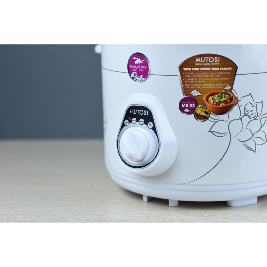 Đặc điểm chính của Nồi nấu đa năng Mutosi MS-33Lòng nồi được làm bằng đất sét tự nhiên kết hợp với công nghệ hiện đại xanh - sạch không gây ô nhiễm, dễ vệ sinh. Thiết kế tinh tế với lớp gốm bên trong nhằm giữ lại hương vị đậm đà của các món ăn không thua kém gì khi nấu bằng phương pháp cổ truyền