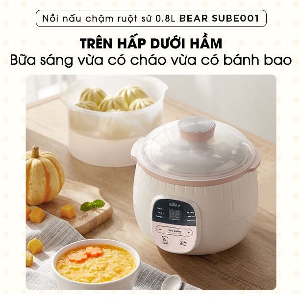 Với nồi nấu chậm Bear dung tích 0,8 lít đi kèm lồng hấp tiện lợi bạn có thể cùng lúc chế biến món hầm, hấp hoặc nấu cháo cho bé mỗi ngày một cách an toàn và đảm bảo dinh dưỡng.