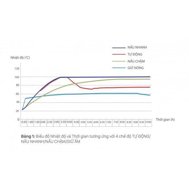 Linh hoạt chọn lựa 4 chế độ nấu: SLOW 4 giúp mẹ chủ động lên kế hoạch chuẩn bị bữa ăn dặm cho bé thật đơn giản, nhanh gọn hơn với 3 chế độ nấu: nấu chậm và nấu nhanh, nấu tự động và giữ ấm. Để hiểu kỹ về 3 chế độ này hãy quan sát đồ thị dưới đây