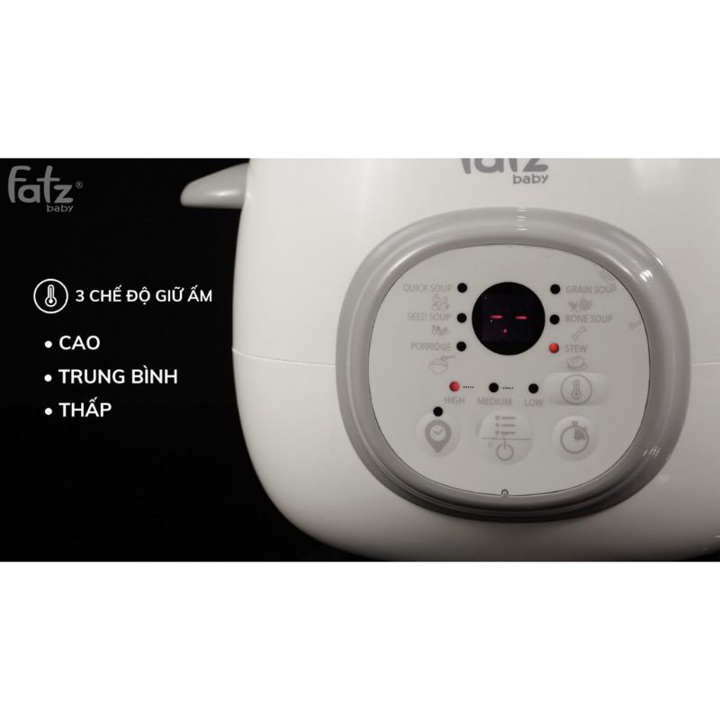 - Chức năng giữ ấm: Với nồi nấu chậm Fatz Baby, sau khi nấu xong thức ăn sẽ được giữ ấm với 3 cấp độ CAO/TRUNG BÌNH/THẤP, đặc biệt nữa là mẹ có thể cài đặt thời gian giữ ấm mong muốn.