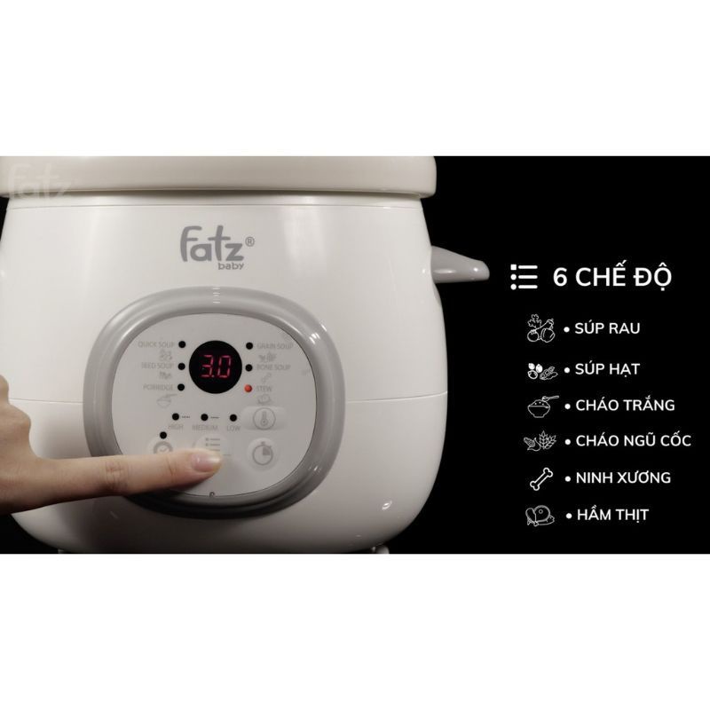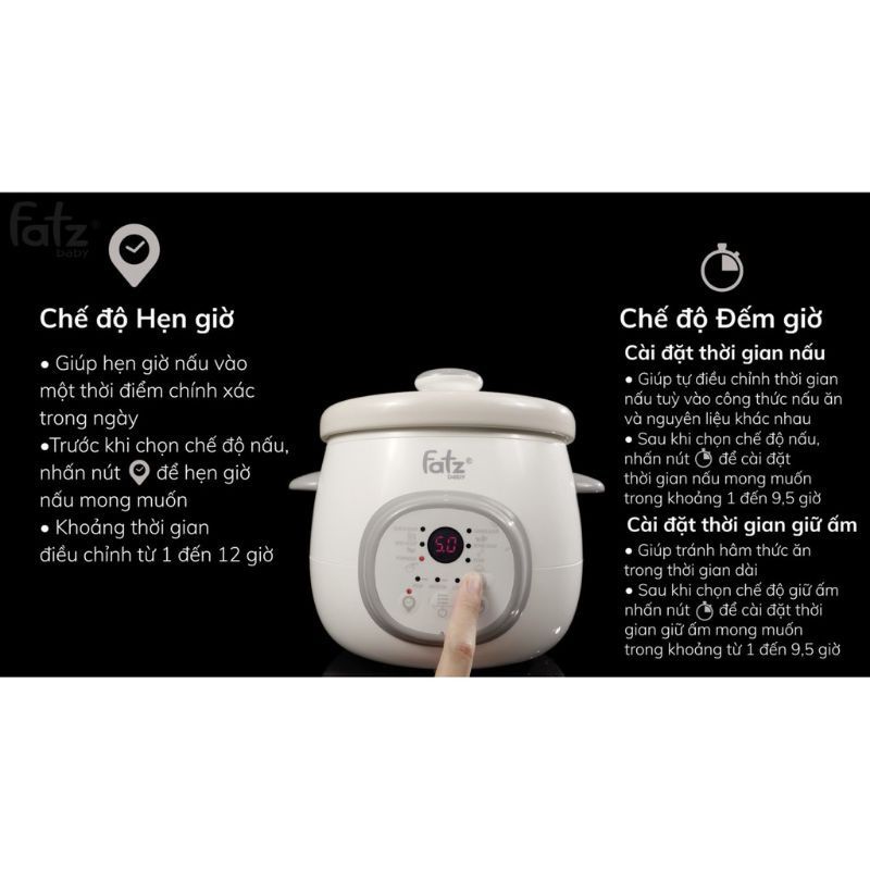 - Chức năng giữ ấm: Với nồi nấu chậm Fatz Baby, sau khi nấu xong thức ăn sẽ được giữ ấm với 3 cấp độ CAO/TRUNG BÌNH/THẤP, đặc biệt nữa là mẹ có thể cài đặt thời gian giữ ấm mong muốn.