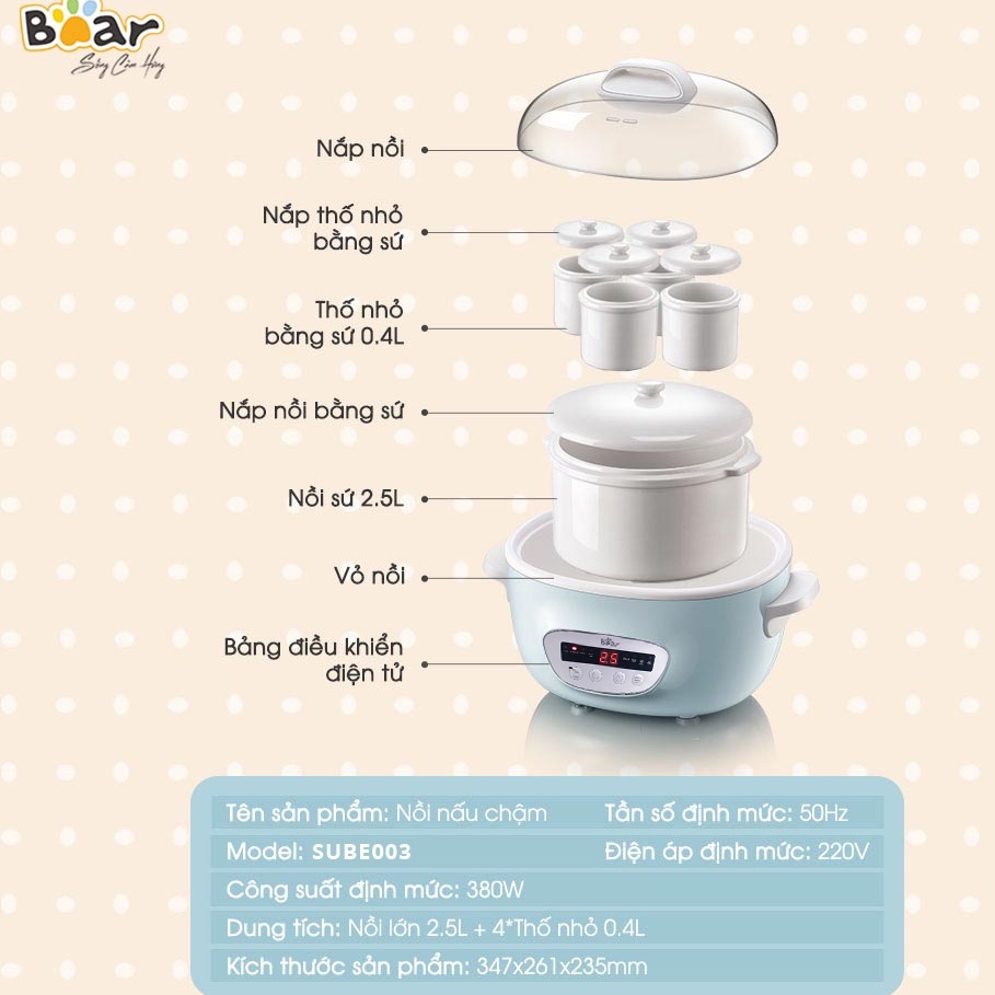 - Nồi nấu cháo chậm Bear SUBE003 có tổng dung tích nồi sứ 3.9L (1 nồi sứ lớn 2.5L + 4 thố sứ nhỏ 0.4L ).