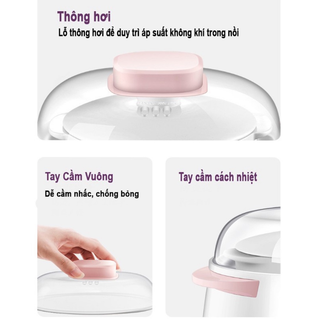 - Chế độ giữ ấm kép: nhấn bằng tay hoặc tự động giữ cho món ăn của bé ấm lâu hơn. Các mẹ chỉ cần nấu 1 lần vào mỗi buổi sáng và cho con ăn cả ngày, ngoài ra nồi có chế độ chống trào nên các mẹ cứ yên tâm đi làm ạ.