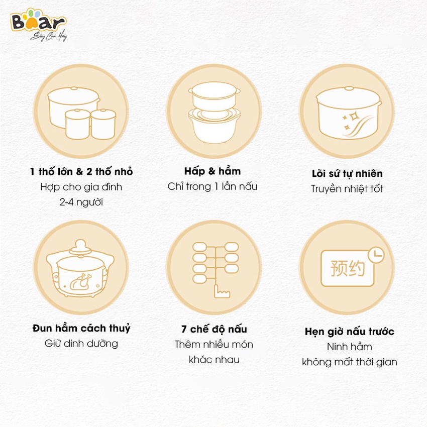 Giới thiệu Nồi Nấu Cháo Chậm Cho Bé Bear dung tích 0.8L, 1.6L, 2.5L kèm lồng hấp (1 đổi 1 trong 30 ngày, Bảo hành 18 tháng)