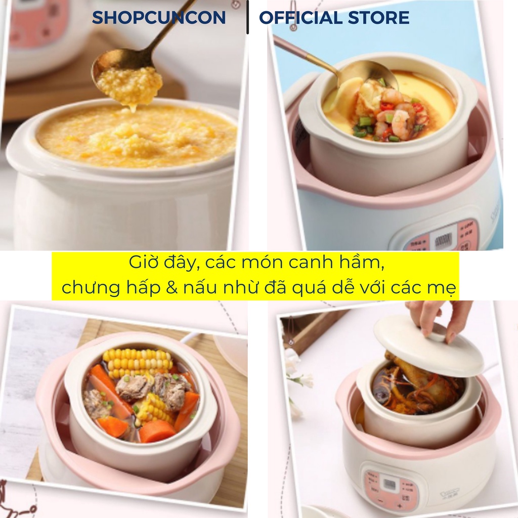 _ Nồi nấu cháo chậm gồm 4 chức năng chính: Hầm, chưng ,nấu canh, và hấp; cực kỳ tiện dụng giúp việc nấu nướng và chế biến ăn dặm cho bé trở nên thật nhẹ nhàng & không mất nhiều thời gian