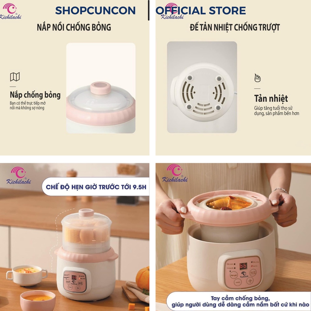Giới thiệu Nồi nấu cháo chậm cho bé ăn dặm Bear Nồi nấu chậm có lồng hấp Kichilachi 0,8l