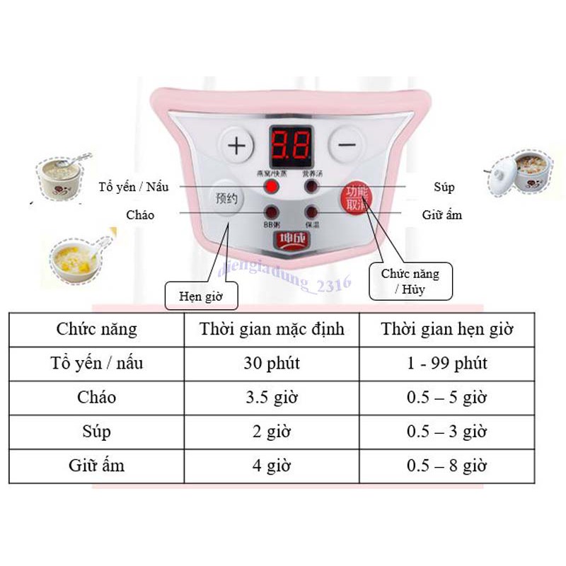 Nồi có tính năng hẹn giờ rất tiện lợi. Ngoài ra, bạn có thể để chế độ bảo quản giữ ấm trong 8 tiếng. Nếu ăn cháo buổi tối thì cắm từ sáng, ăn sáng thì cắm từ tối. Sản phẩm rất tiện dụng mà cháo cũng vẫn còn nóng nguyên.