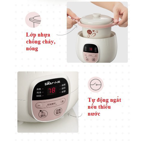 - Nồi nấu cháo chậm Bear 0.8l có thể: Nấu cháo, nấu chè, hầm gà, chung yến, hấp rau củ quả....