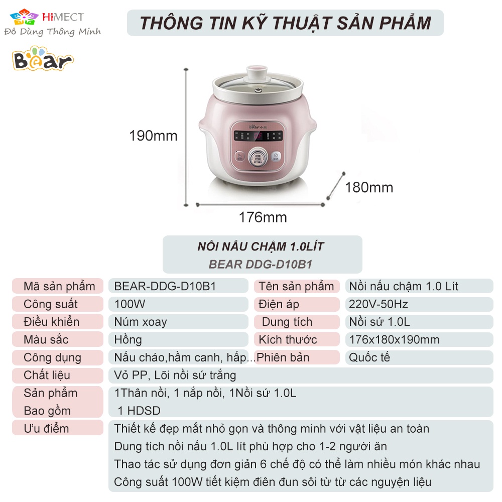 Nồi Nấu Cháo Cho Bé Hầm Chậm Đa Năng Đẹp Tiện Dụng Bear Dung tích 1 Lít DDZ-D10B1S- HiMect