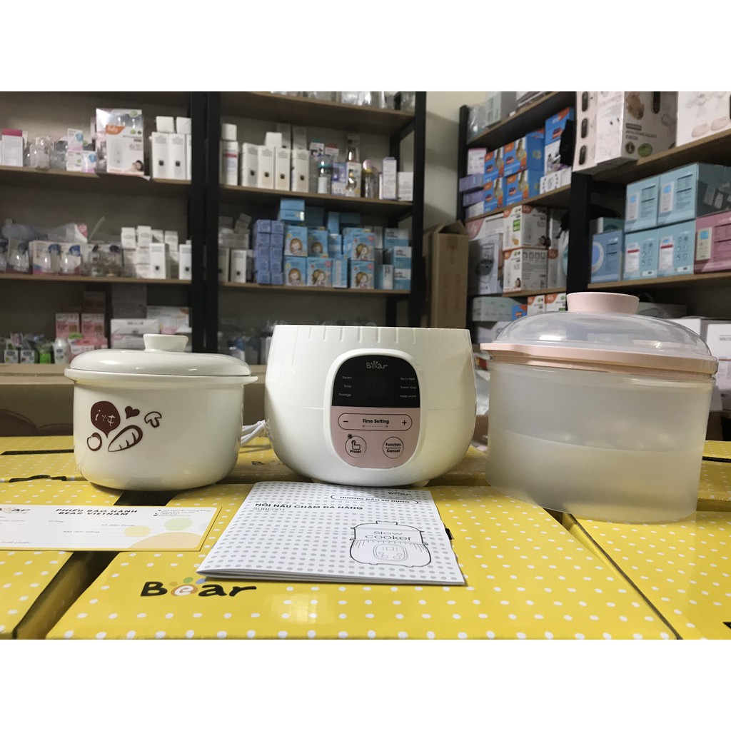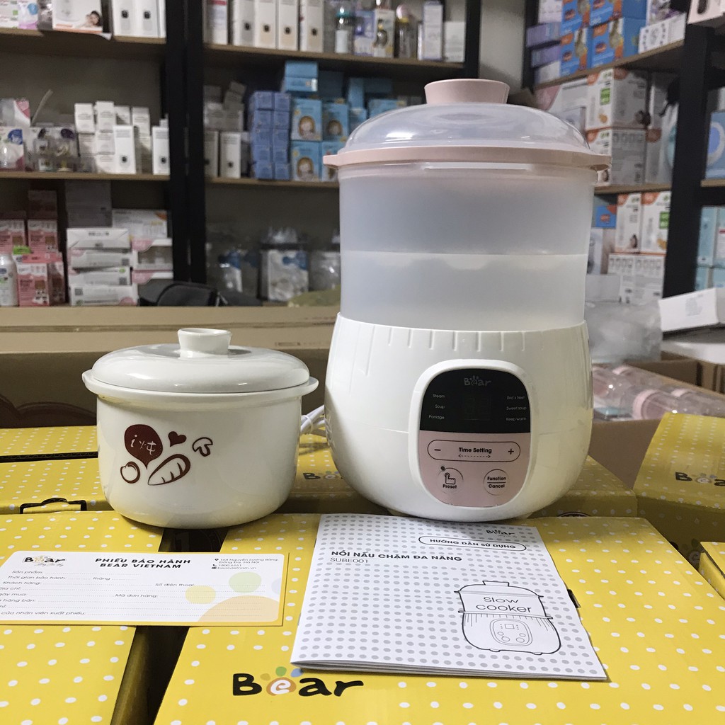 Bear Vừa là nồi ninh cháo hầm cháo cách thủy vừa là nồi hấp mẹ không cần phải lo đứng canh nổi cháo để khỏi bị trào ra ngoài chỉ vần cho gạo nước rau củ quả hay thịt cá vào rồi bấm nút là xong.