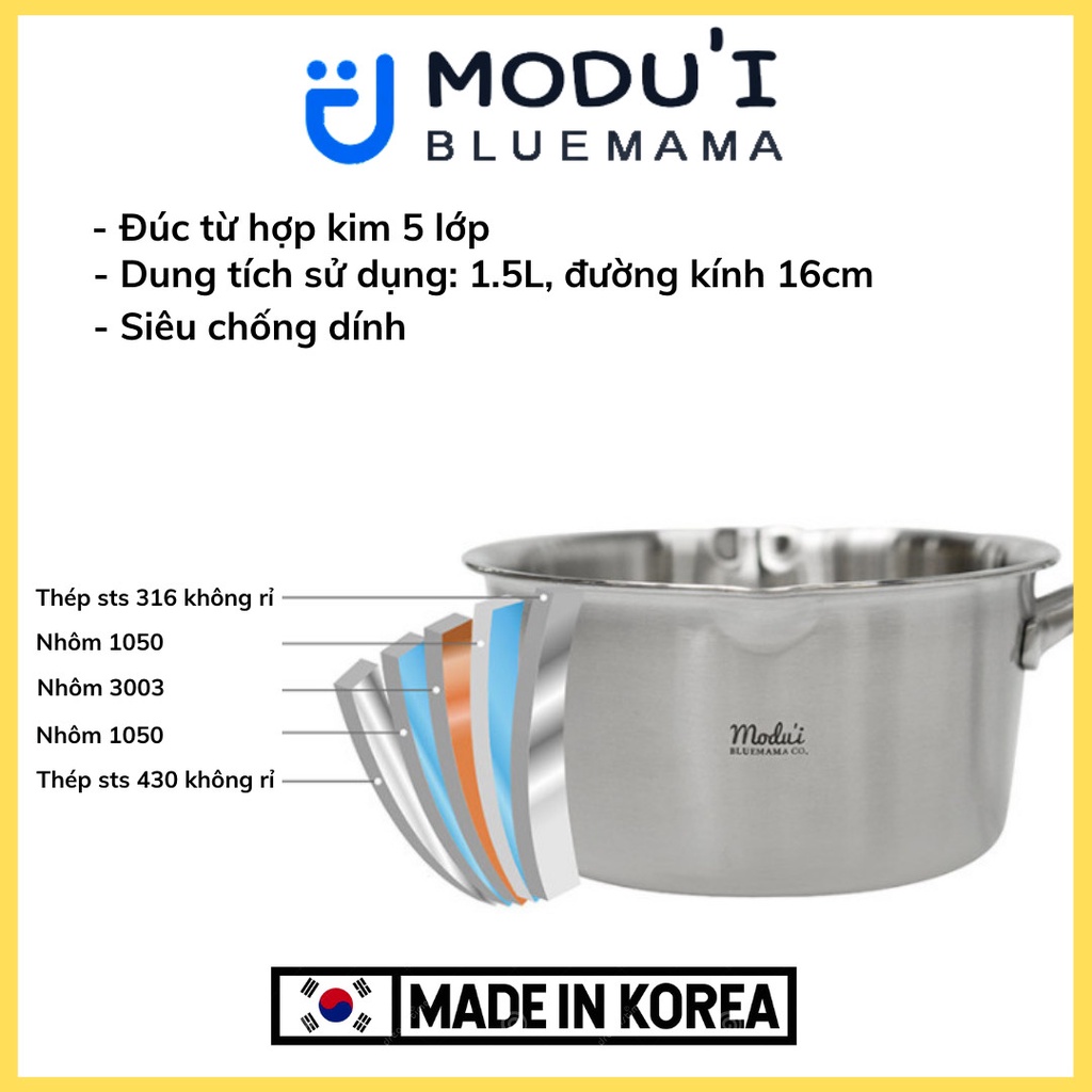 - Nồi quánh nấu bột 2in1 Modui Bluemama dùng cực bền, thu nhiệt nhanh, tỏa nhiệt đều, giữ nhiệt lâu, chống oxy hóa, chống cháy khét, dễ chùi rửa.