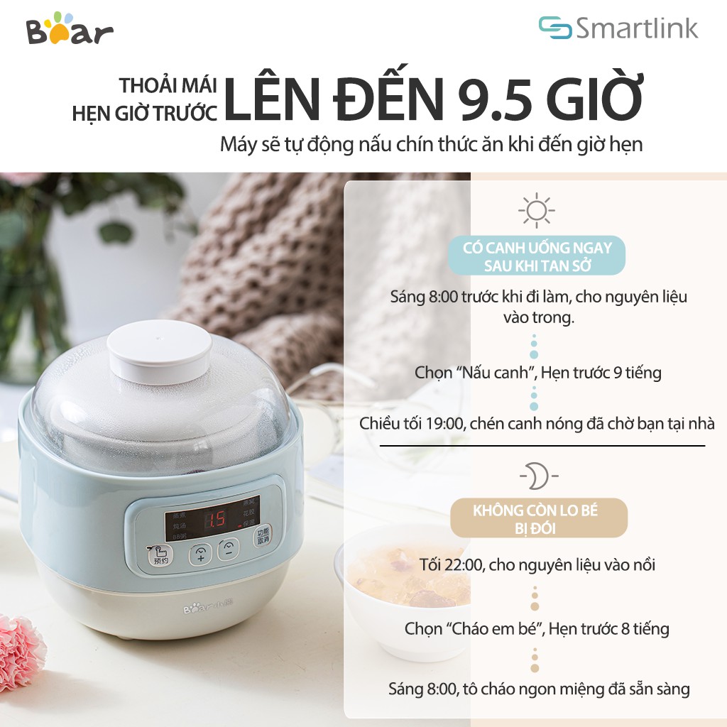 ✔️Nồi hầm điện Bear được thiết kế với kiểu dáng nhỏ gọn, thao tác sử dụng đơn giản. Ngoài chức năng nấu cháo, các tính năng khác của máy như chưng yến, hầm gà, hấp rau củ quả..v.v