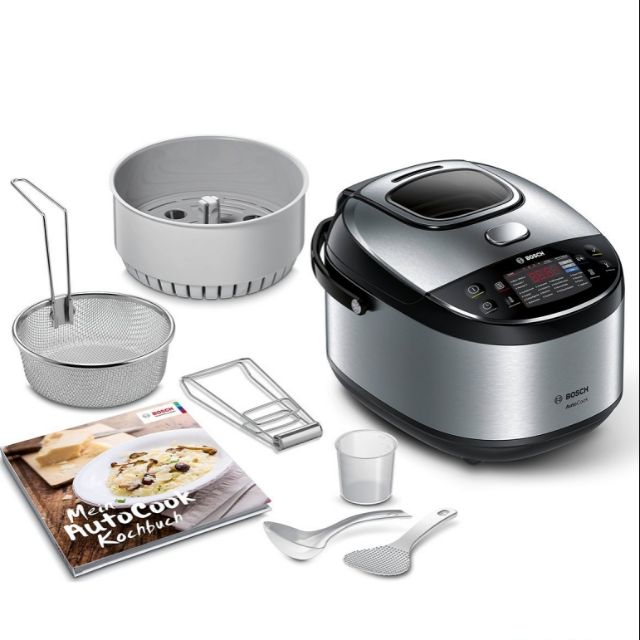 - Bộ nồi đa năng Bosch gồm 1 nồi như nồi cơm điện, bên trong có 1 nồi chống dính dung tích 5l, 1 rổ chiên, 1 xửng hấp, 1 muôi, 1 thìa, 1 ca nhỏ đong nước và 1 dụng cụ gắp.