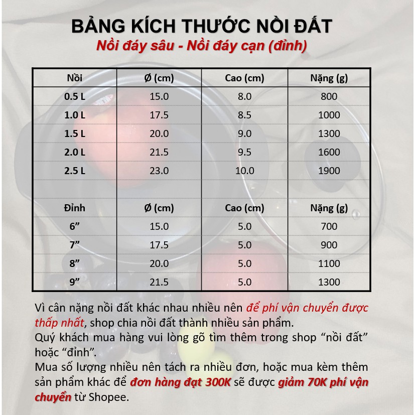 - Nồi 7 inches: cao 5.0 cm x miệng 17.5 cm
