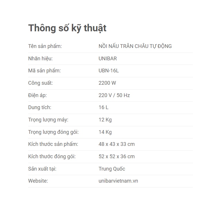 Nồi Unibar 16L : bản mới tiếng việt