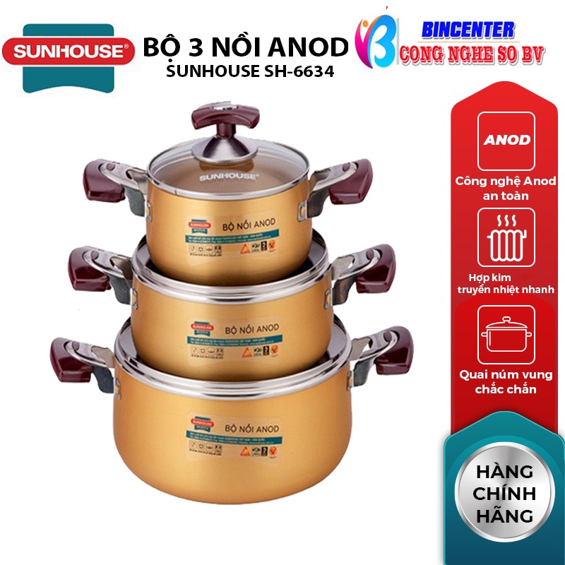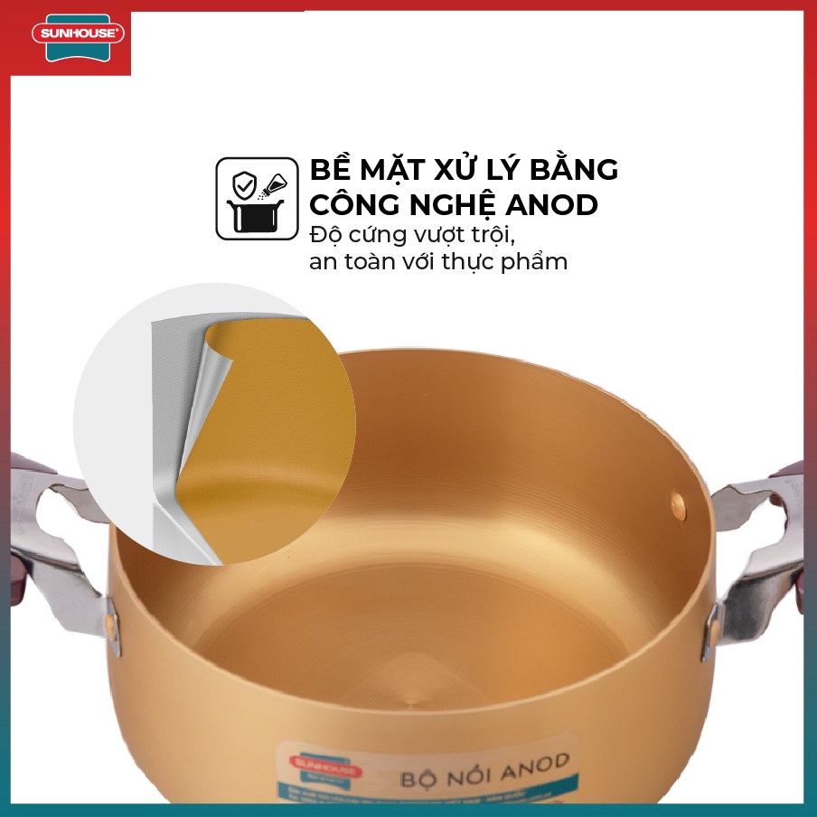 Bộ Nồi Nhôm Anod SUNHOUSE Cao Cấp SH6634, Bộ 3 Nồi Sunhouse Dùng Bếp Gas Bếp Hồng Ngoại - Hàng Chính HãngĐẶC ĐIỂM NỔI BẬT Bộ nồi Anod vàng Sunhouse SH6634