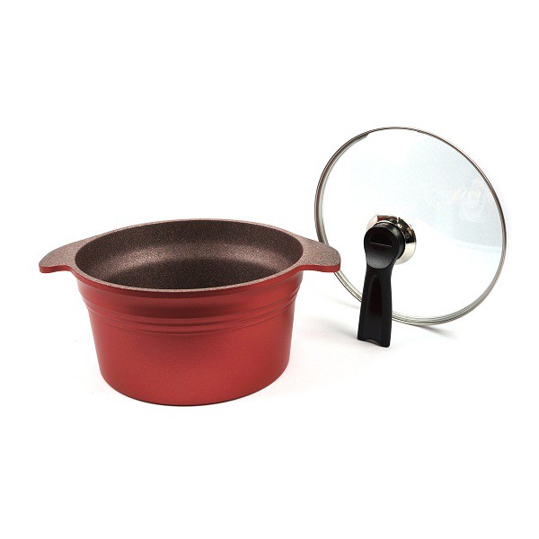 Màu sắc: Thân ngoài phủ sơn đỏ, lòng nồi phủ đá granit, vung thủy tinh, tay cầm nhựa màu đen