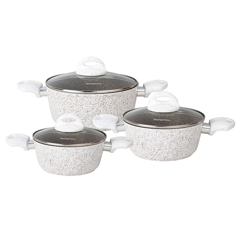 Bộ nồi nhôm Kangaroo KG995 vân đá hoa cương chống dính siêu bền là sự lựa chọn hoàn hảo cho những ai đang tìm kiếm một thiết bị nhà bếp chất lượng cao và tô điểm thêm không cho gian bếp hiện đại.Kiểu dáng hiện đại