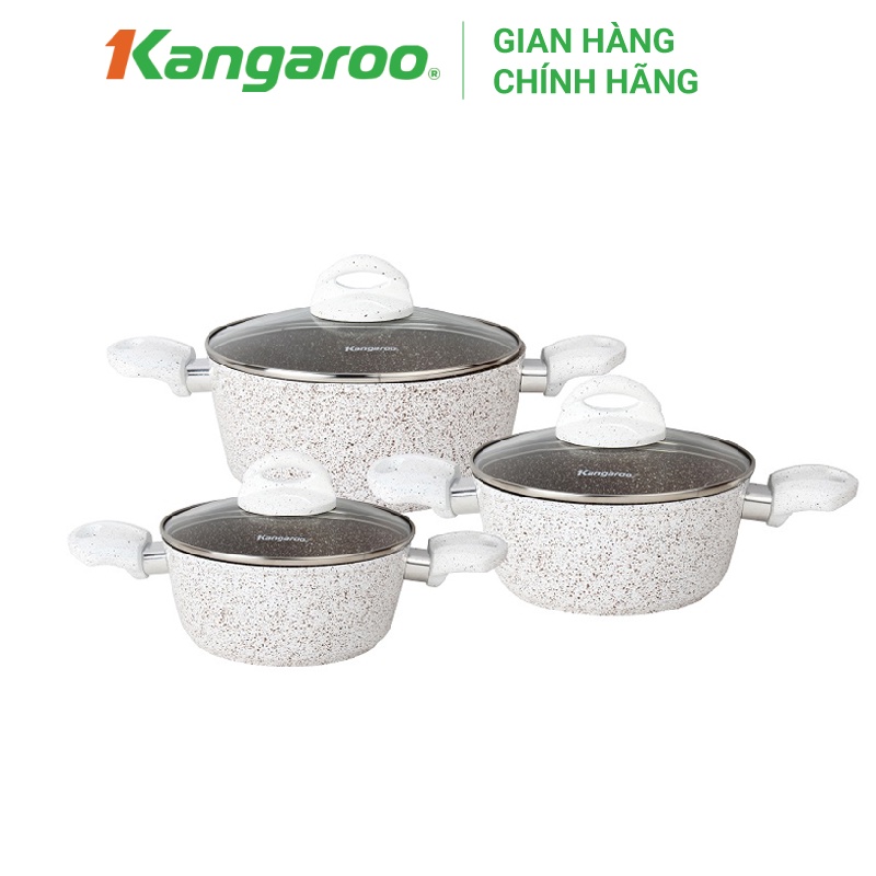 Bộ nồi nhôm Kangaroo KG995 gồm 3 kích thước khác nhau 18cm, 20cm, và 24cm, màu sắc trẻ trung, hiện đại khiến cho không gian bếp trở nên rực rỡ hơn.