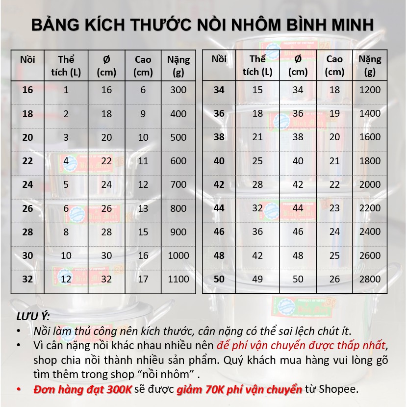 • Kích thước: Dung tích này tính đầy nồi, mọi người nên mua lớn hơn để dễ khuấy khi nấu. Nồi làm thủ công nên kích thước có sai lệch chút ít.
