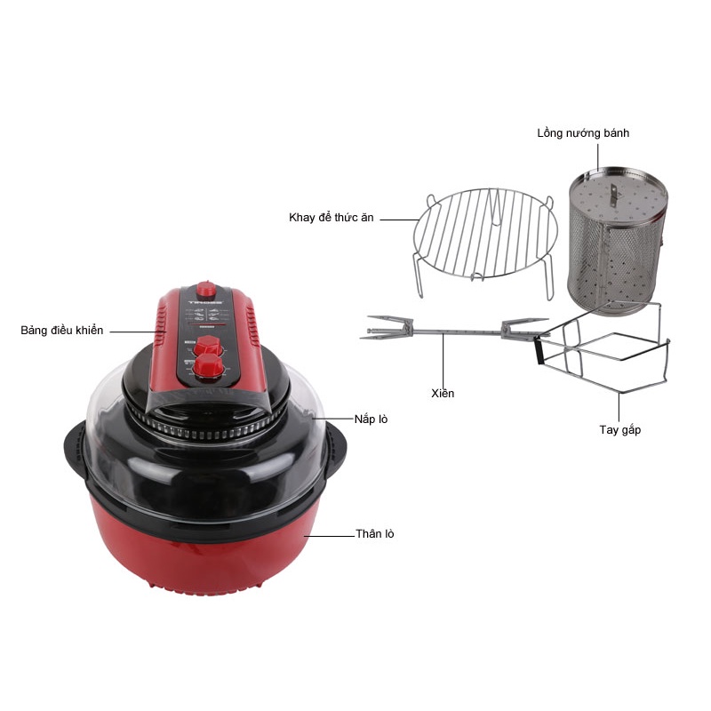 Nồi nướng chân không đa năng Tiross TS903 sở hữu thiết kế tiện lợi với nhiều phụ kiện đa năng đính kèm như lồng chiên, trục xiên 360 độ, giá đỡ thực phẩm, giúp bạn nấu chín thực phẩm theo nhiều cách khác nhau mà vẫn đảm bảo thức ăn thơm ngon.