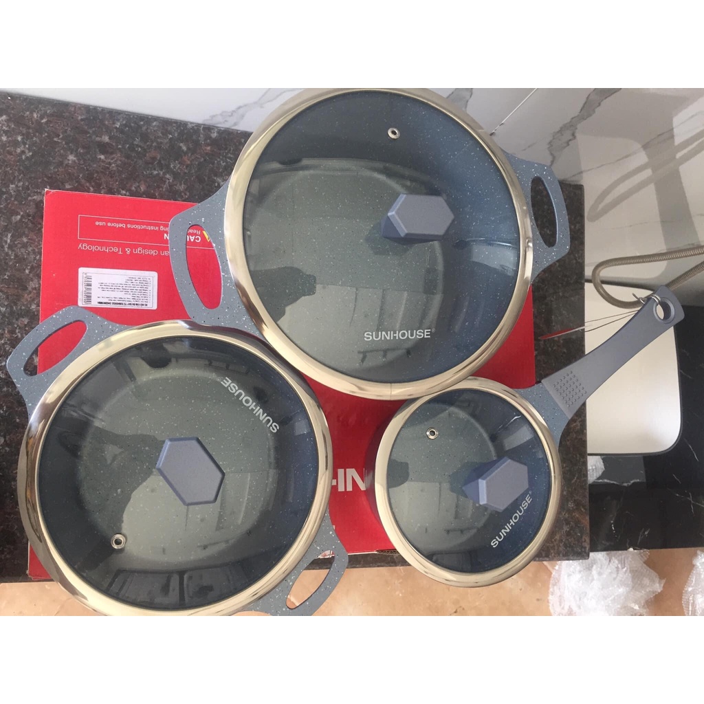 Giới thiệu Bộ nồi, quánh vân đá Sunhouse Mama đáy từ, dùng được bếp điện từ, mã SHG2003MMA (có bán lẻ nồi/quánh)