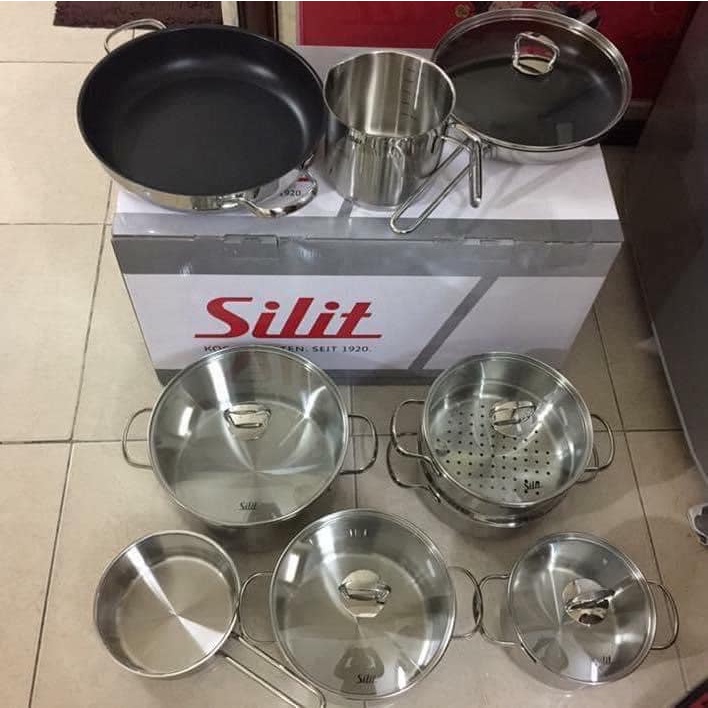 Bộ nồi Silit Toskana 10 món đầy đủ nồi, chảo, xửng hấp cho gia đình đông người.- Chất liệu Inox 18/10 an toàn cho sức khỏe