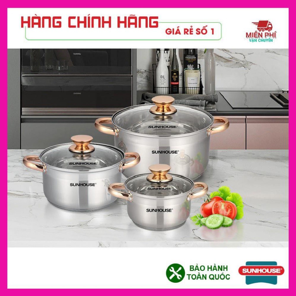 Bộ Nồi Sunhouse Bộ Nồi Inox Sunhouse 5 Đáy Dùng Cho Bếp Từ, Bếp Gas,Bếp Hồng Ngoại 3 Nồi Kích Thước: 16cm, 20cm, 24cm.