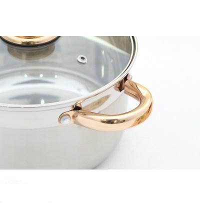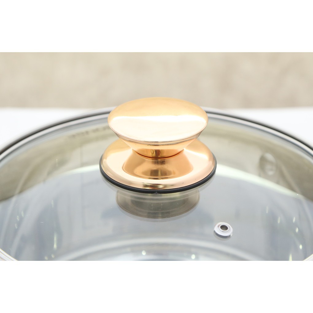 Nắp kính trong suốt giúp nấu ăn tiện dụng, chịu được nhiệt độ cao. Quai núm nắp inox mạ vàng tinh tế.