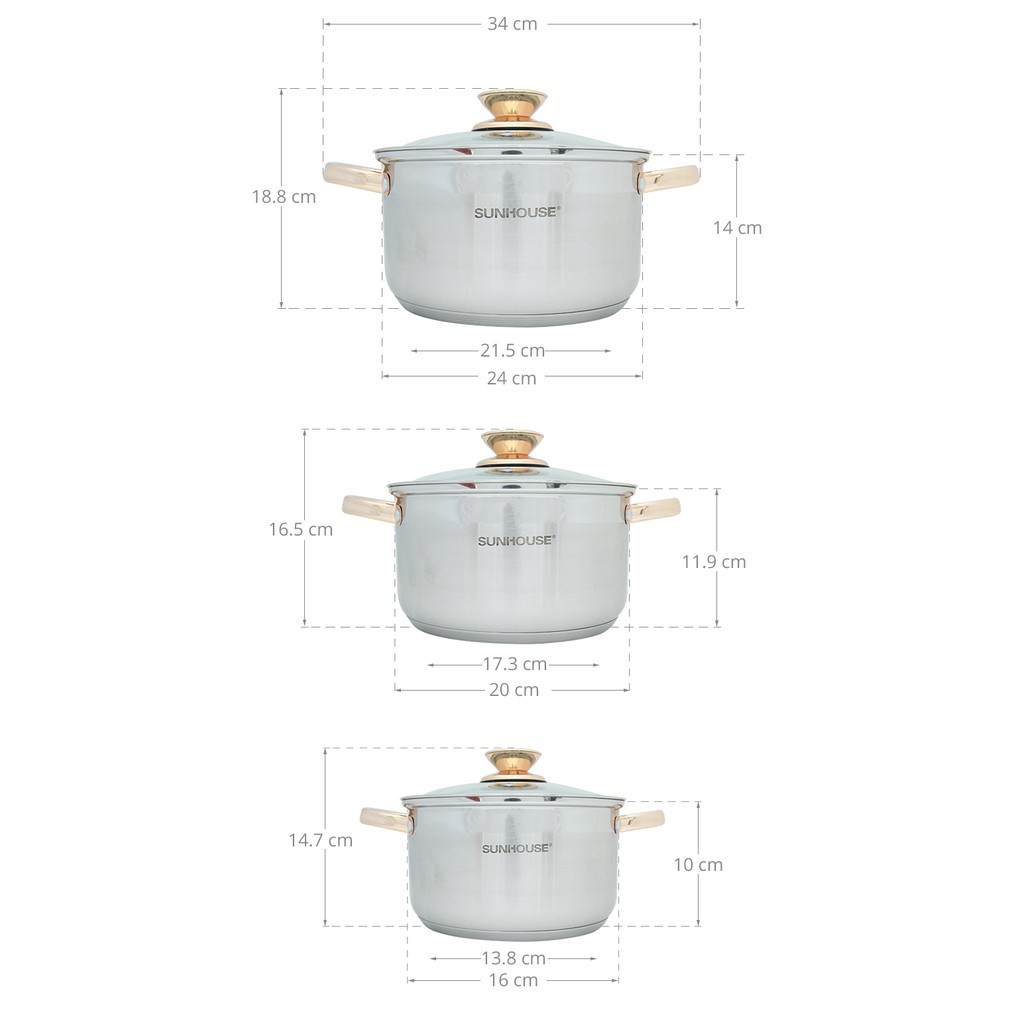 Giới thiệu Bộ Nồi SUNHOUSE Inox cao cấp đáy dày 5 Lớp SH781(16-20-24cm)có bán lẻ size, nấu được trên bếp từ