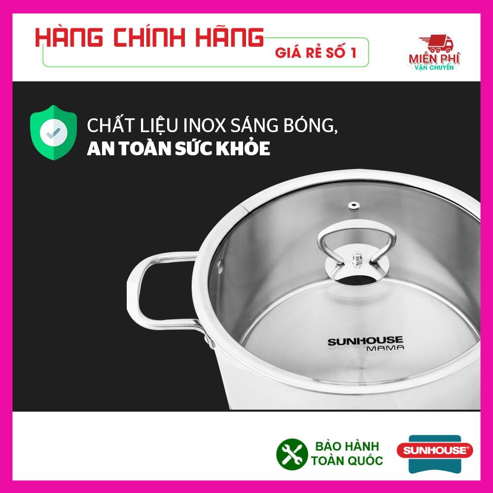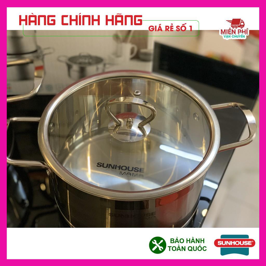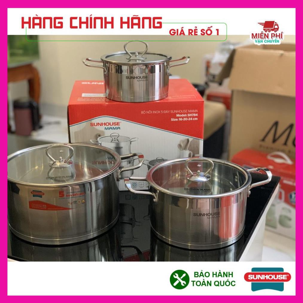 - Bộ nồi inox 5 đáy SUNHOUSE MAMA SH784 được làm bằng chất liệu inox sáng bóng, an toàn sức khỏe, sản phẩm gây ấn tượng bởi kiểu dáng tinh tế, hiện đại cùng 5 lớp đáy dày, tỏa nhiệt đều, giúp thức ăn chín đều ngon hơn, hạn chế cháy khét. Bộ sản phẩm gồm 03 nồi với đường kính 16- 20- 24cm, đáp ứng tốt nhu cầu nấu nướng hàng ngày tại gia đình.