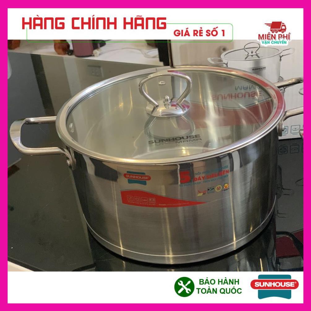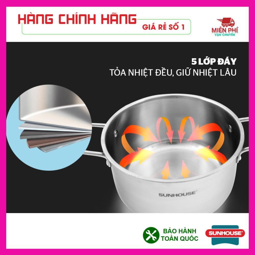 - Bộ nồi inox 5 đáy SUNHOUSE MAMA SH784 có cấu tạo 5 lớp đáy dày dặn, giúp nhiệt lượng tỏa đều khắp đáy, thức ăn chín ngon, giảm cháy khét hiệu quả.