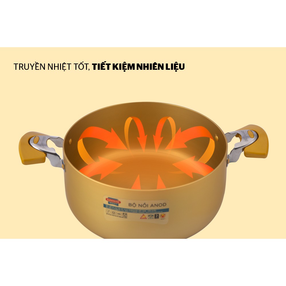 Kiểu dáng hiện đại, kết cấu bền chắc: Bộ nồi Anod SUNHOUSE được làm từ hợp kim nhôm Anod cứng bằng công nghệ tiên tiến giúp sản phẩm có độ cứng và bền vững cao, chống ăn mòn, chịu được nhiệt độ cao cũng như khả năng chống dính tốt. Vỏ ngoài màu vàng nổi bật, chịu nhiệt tốt, không biến màu theo thời gian.