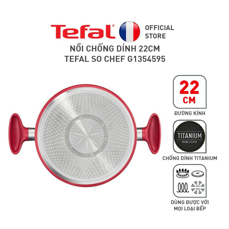 Nồi Tefal So Chef - Lớp phủ bền chắc, độ bền xuất sắc.Nồi, chảo Tefal So Chef thiết kế từ Pháp được làm bằng hợp kim nhôm cao cấp với màu đỏ sang trọng bên trong là phủ lớp chống dính Titanium Reinforced, thích hợp cho nhiều kiểu nấu nướng, sử dụng được trên bếp từ.