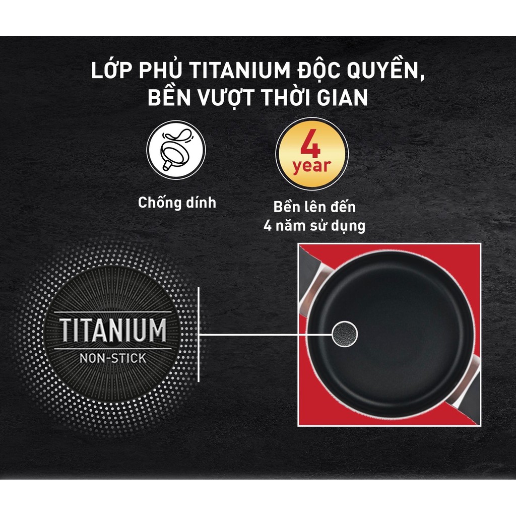 - LỚP PHỦ TITANIUM Bền chắc với hơn 16,000 lần chà nhám.- Lớp phủ Titanium nonstick mang lại khả năng chống dính tuyệt vời và độ bền vượt trội, có thể sử dụng ít dầu khi nấu ăn.